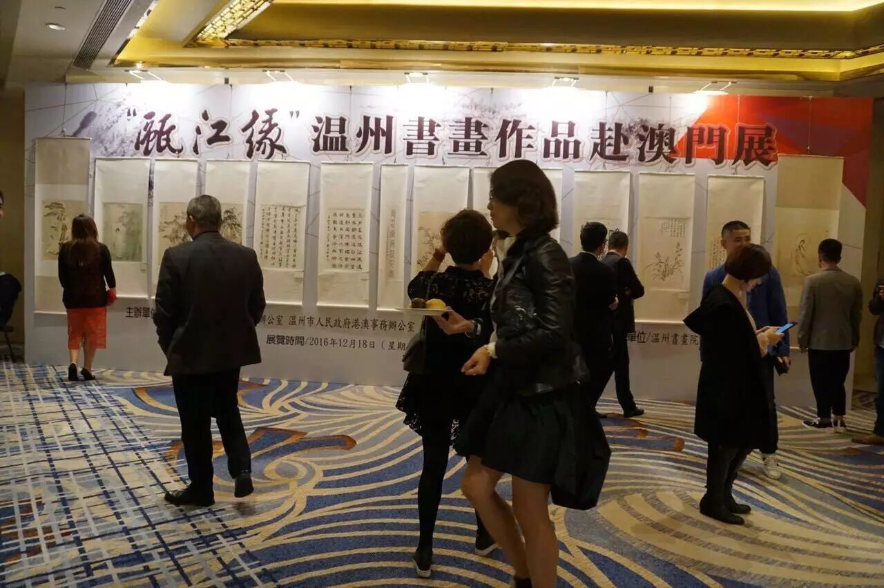 12月18日下午,“瓯江缘”温州书画作品赴澳门展在澳门新濠影汇展出,温州市人大常委会主任葛益平、温州市人民政府外事侨务办公室(港澳事务办公室)主任邱华萍、温州市委统战部副部长叶军、温州市人大民宗侨外工委副主任许瓯、澳门温州人商会会长林小冬等出席。本次展览共展出作品47件,作品在沿袭传统的基础上融合了当代特色的视觉语汇,书法作品秉“清正典雅”之风,真草篆隶行五体兼备;国画作品题材丰富,涵盖了山水、花鸟、人物等,工笔精妙、写意传神。展出期间,许多前来观展的同胞们驻足在作品前,细细观摩家乡的艺术,谈论着自己熟悉的艺术家,在异乡找到了归属感。12月21日,展览圆满结束,有关人员凯旋归来。